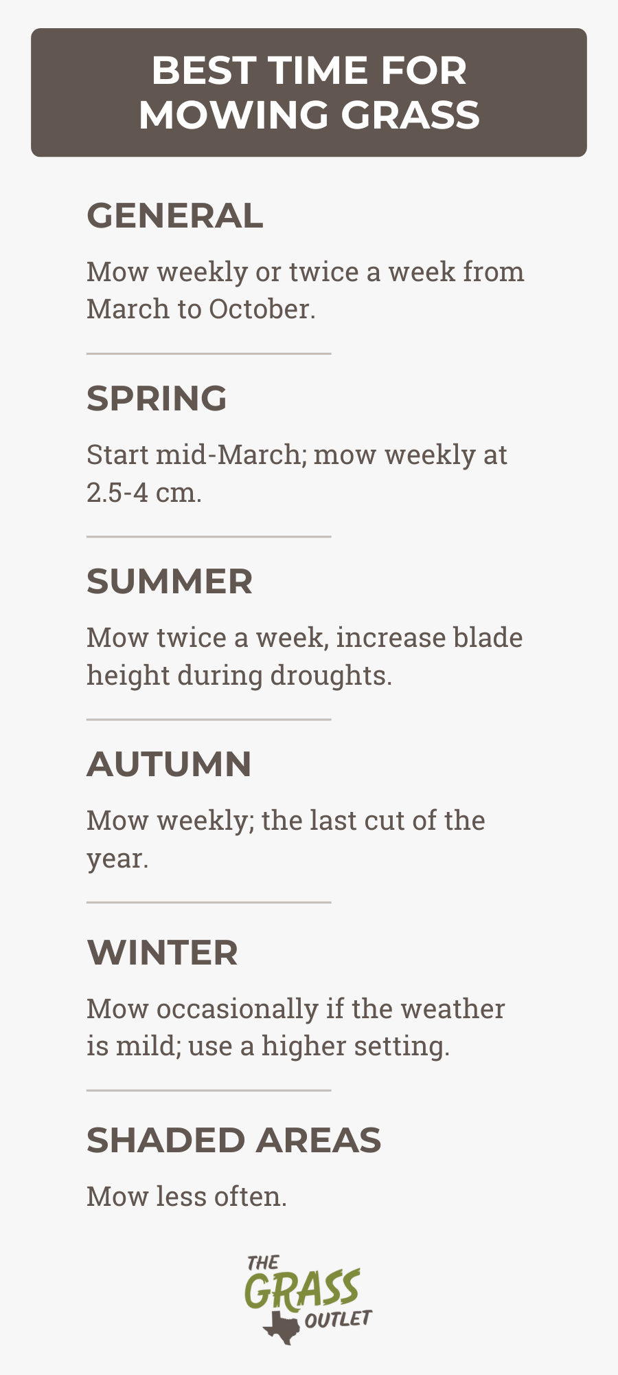 Para un césped bien cuidado, el corte debe hacerse generalmente una o dos veces por semana de marzo a octubre. Sin embargo, si el tiempo es suave, puede prolongarse hasta el invierno. La fecha inicial de corte depende de las condiciones locales y no siempre empieza en marzo. La frecuencia de corte depende del estilo de césped deseado, las condiciones meteorológicas y el ritmo de crecimiento de la hierba. Además, la frecuencia de corte y la altura del césped varían según la estación y la especie de hierba.