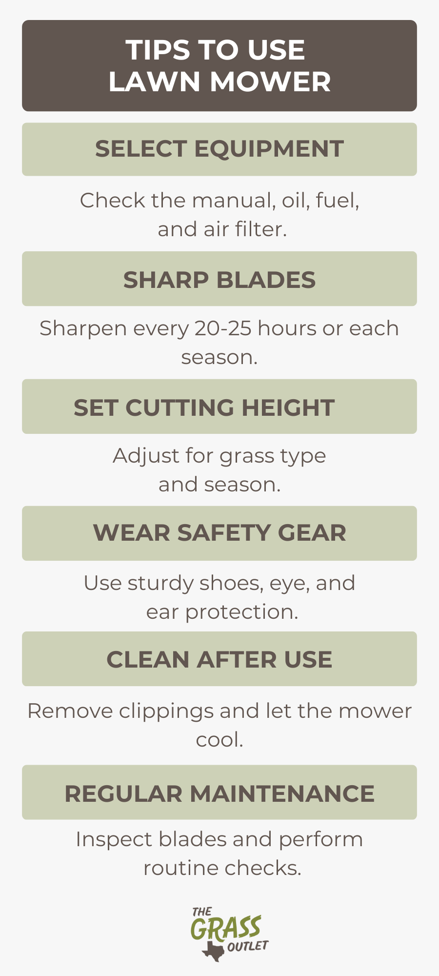 En primer lugar, seleccione el equipo adecuado. Lee el manual del usuario para conocer las instrucciones específicas y las directrices de seguridad, y asegúrate de que el cortacésped está en buenas condiciones de funcionamiento comprobando el aceite, el combustible y el filtro de aire.