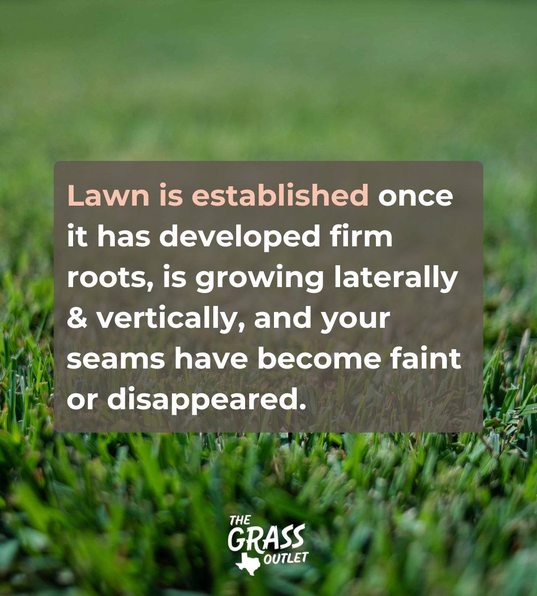 Una vez que el césped se haya establecido por completo, debe empezar a un programa de riego regular. Conocerá su el césped está establecido cuando ha desarrollado raíces firmes, crece lateral y verticalmente, y sus costuras se han debilitado o han desaparecido.