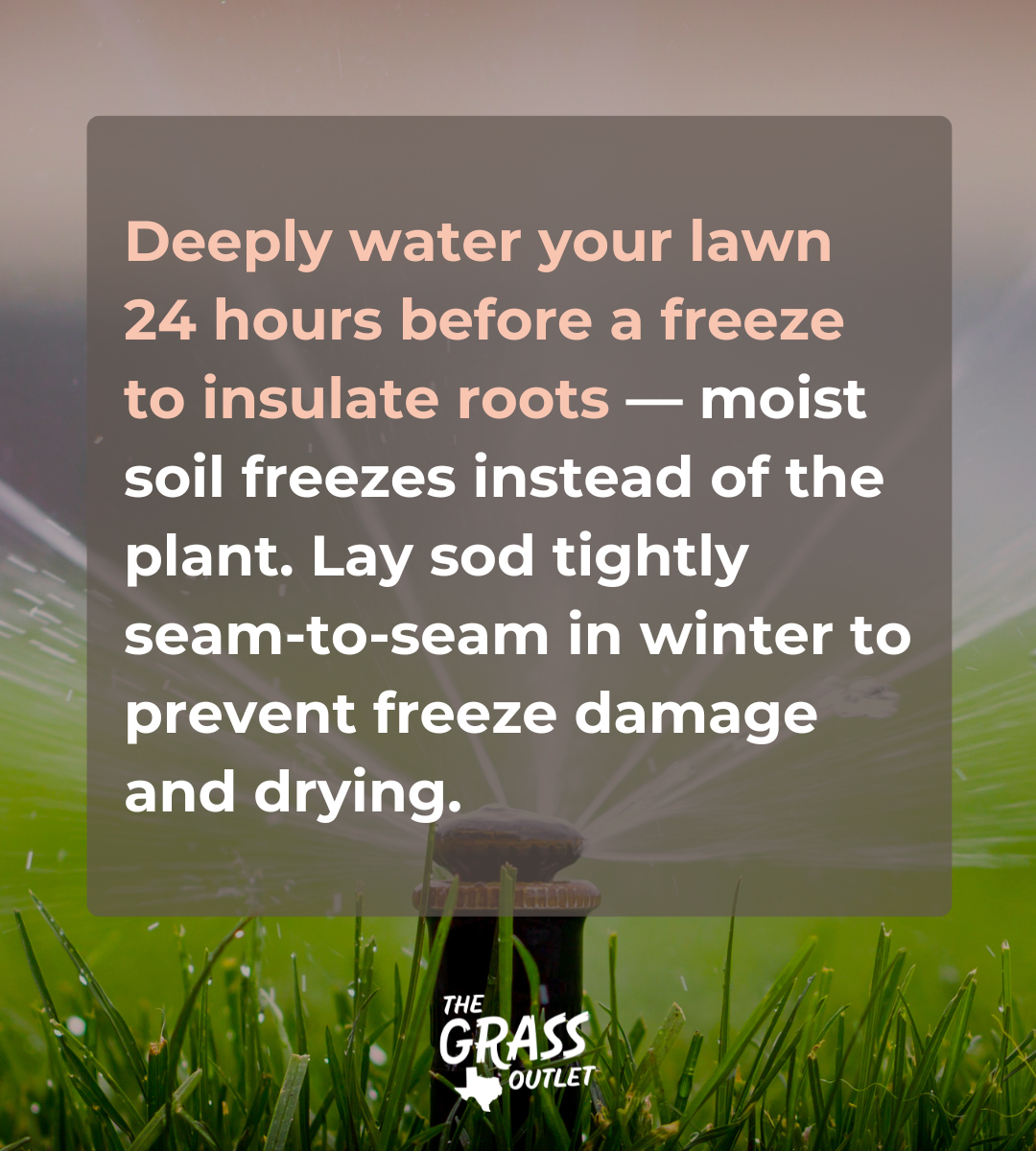 Es importante señalar que la mayoría de las personas que pierden el césped durante el invierno lo hacen por falta de humedad. Mientras haya la humedad adecuada, el agua se congelará en lugar de la planta. Saturar profundamente el suelo 24 horas antes de una helada calentará el suelo y ayudará a aislar y proteger el sistema radicular. Al instalar el césped durante el letargo invernal, es esencial evitar huecos colocando los bloques de césped lo más juntos posible, sin que se solapen. Colocar el césped costura con costura también ayudará a proteger el césped de las heladas y secándose.